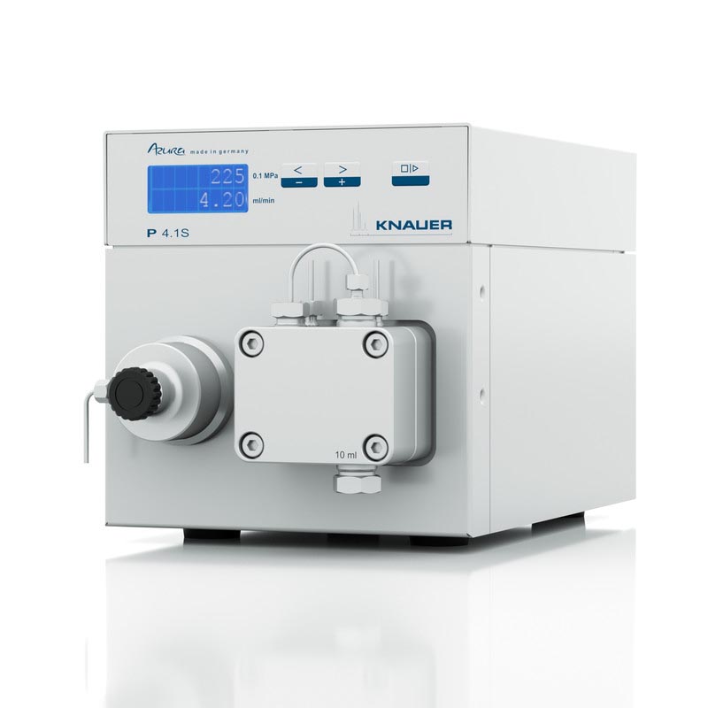 The AZURA pump P 4.1S (APG20EB) is developed for the eluent delivery with flow rates up to 10 ml/min and a maximum delivery pressure of 400 bar. This compact pump can easily be integrated into every HPLC system. It can be used as a small HPLC pump, an injection module or dosing pump.