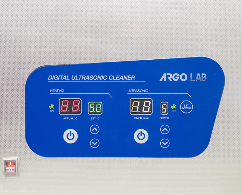 Argo Lab ultrasonic cleaner baths with housing made of top quality stainless steel. Timer for countdown and built-in heating to 60°C for DU series and 80°C for AU series. DU series with digital controller and display with indication of actual and setting temperature (no mod. DU-06), timer and ultrasonic power control (no mod.
