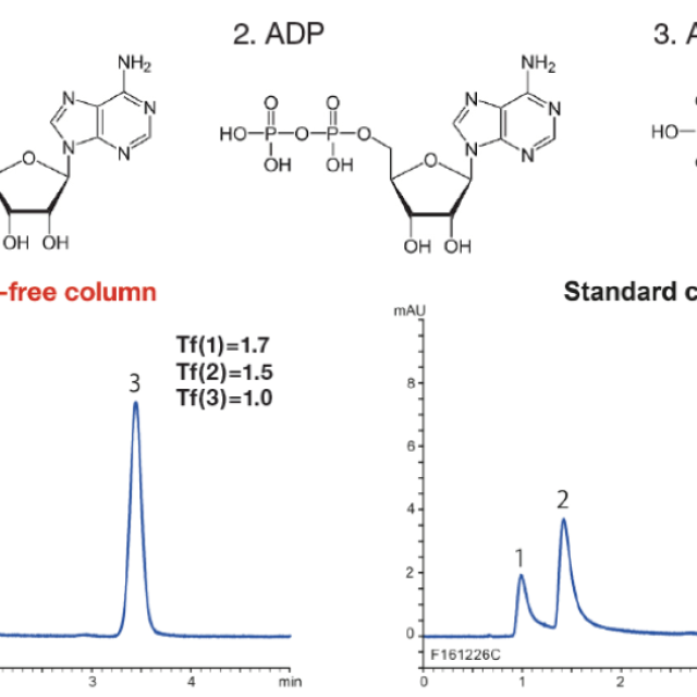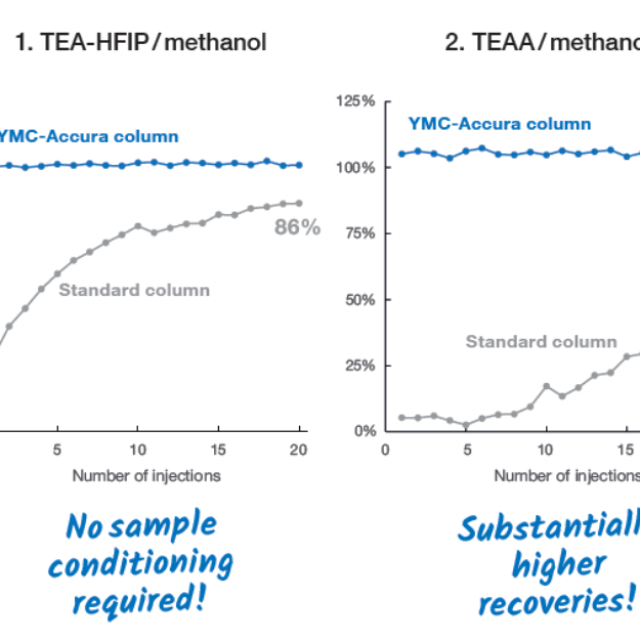 The new YMC-Accura Triart (U)HPLC columns are characterised by a bioinert surface coating on the column body and frit. YMC-Accura columns are ready to use without any preconditioning, unlike the analysis of sensitive substances using standard columns. The sensitivity is significantly enhanced and precious samples are recovered without any loss. The coating is less hydrophobic compared to the PEEK-lining used in the YMC-Triart metal-free (U)HPLC columns. It is intended primarily for challenging substances such as oligonucleotides, nucleotides, selected proteins/peptides and metal-coordinating small molecules e.g., organophosphates.