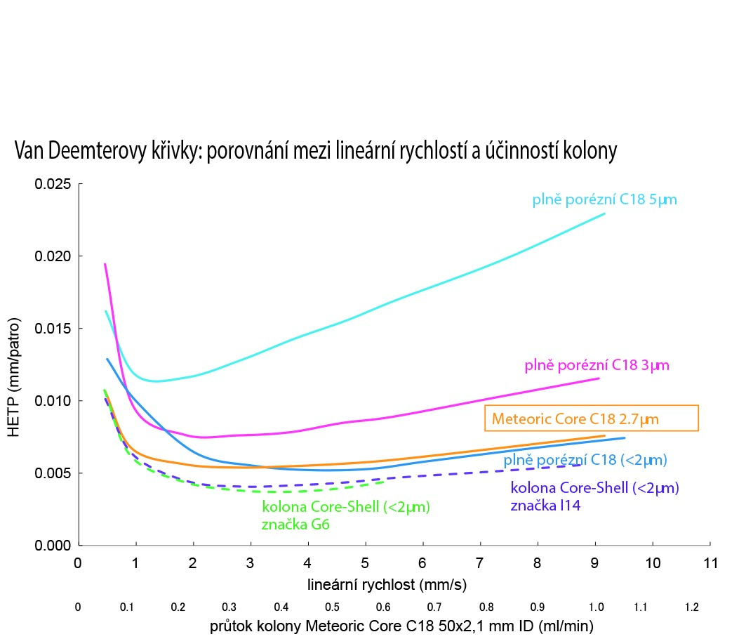 Meteoric Core C18 and Meteoric Core C8 can shorten the analysis time by two thirds when compared to conventional fully porous columns with the same column dimensions run under the same analysis. Theoretical plate number is maintained at 2× faster flow rate for the Meteoric Corecolumn compared to fully porous columns, while resolution is maintained at an operating pressure below 340 bar.