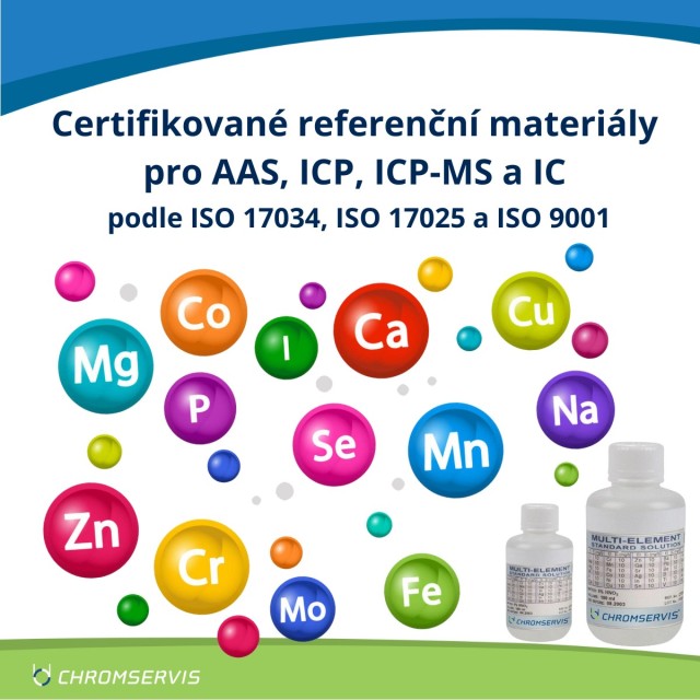 Chromservis oferuje certyfikowane materiały referencyjne dla AAS, ICP, ICP-MS i IC przygotowane zgodnie z ISO 17034, ISO 17025 i ISO 9001.